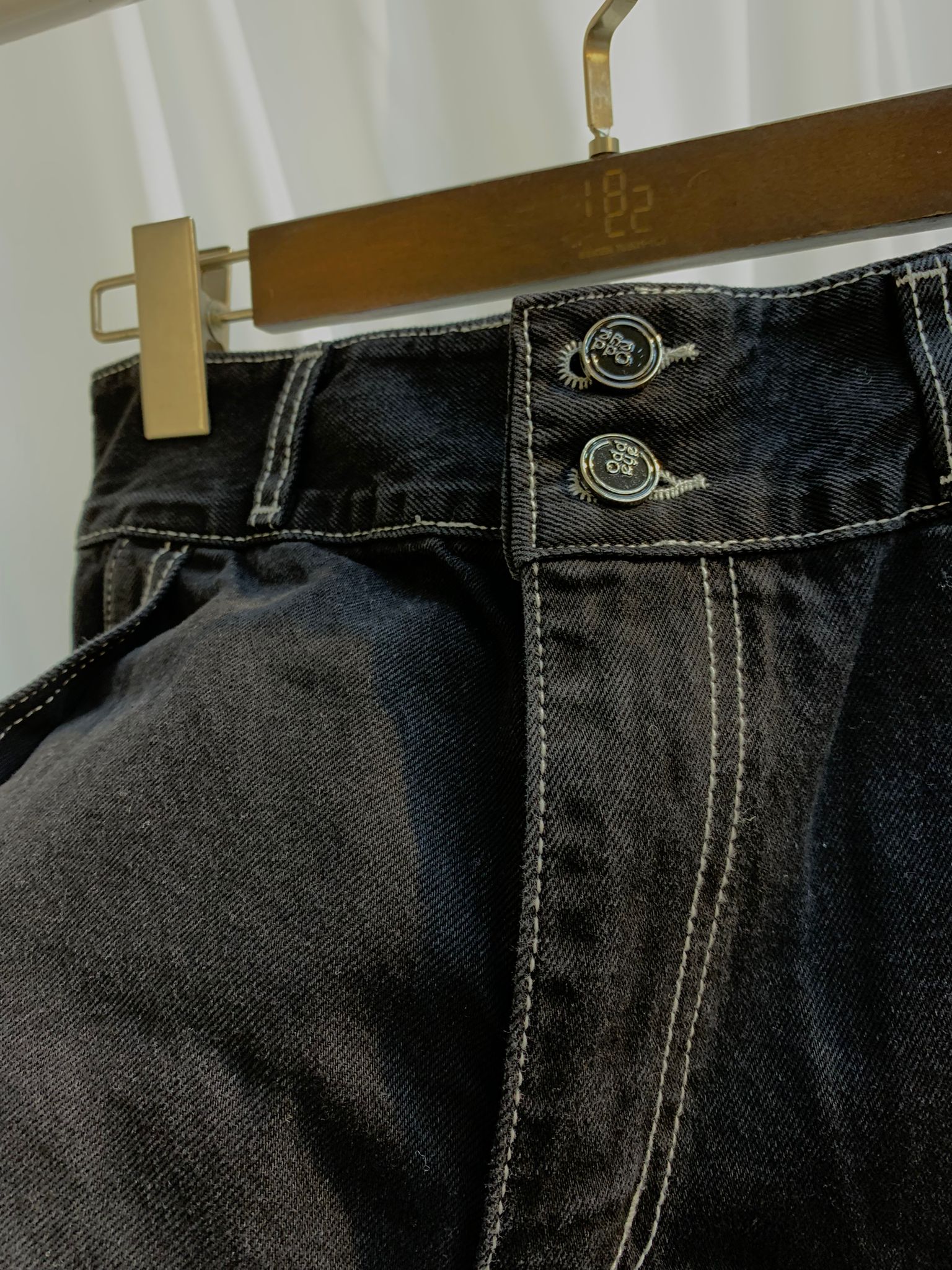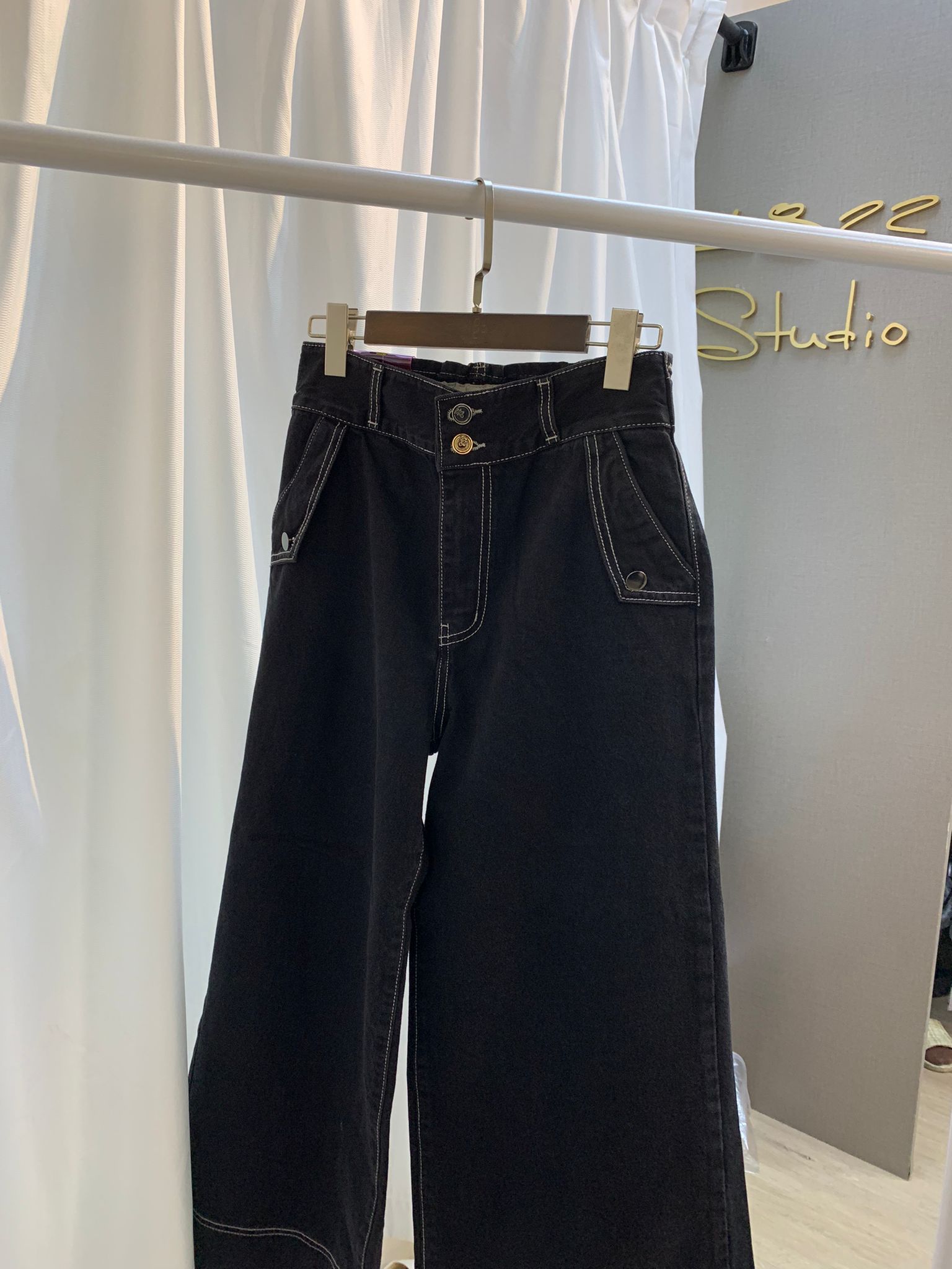 * 高腰設計,突顯腰線 * 闊腿剪裁,打造輕鬆休閒的廓形 * 優質牛仔布,經久耐用,穿著舒適 * 經典黑色水洗,搭配白色對比縫線