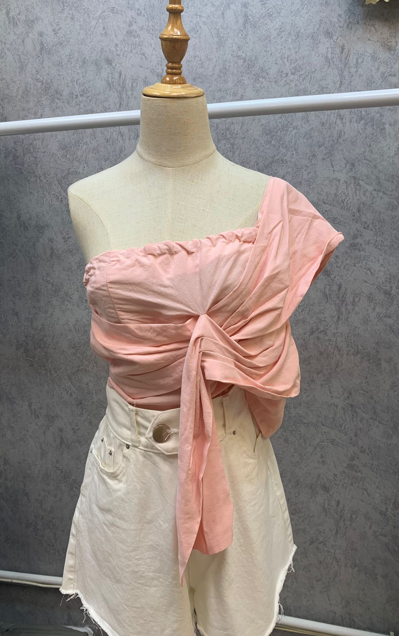 時尚粉色單肩系帶上衣+白色牛仔短褲
