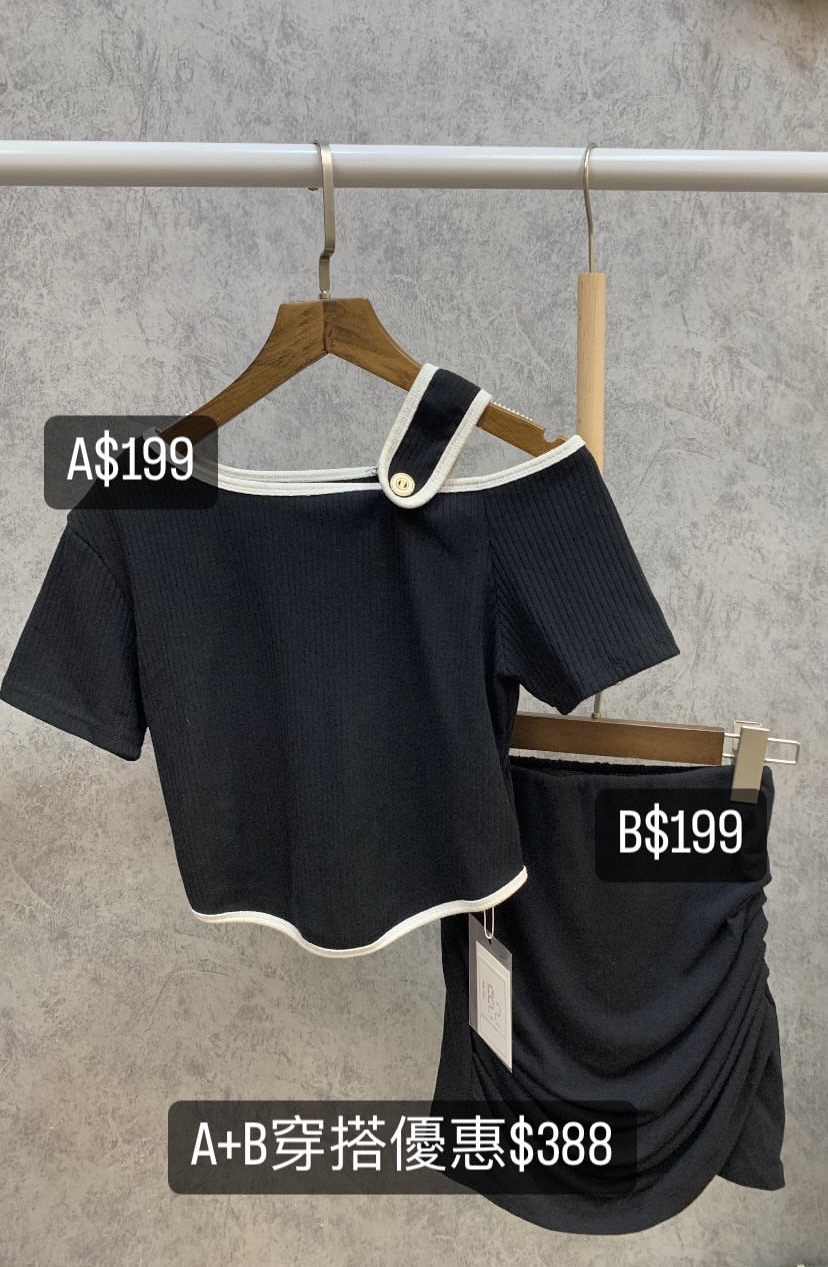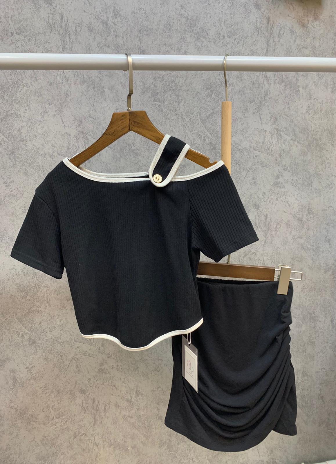 簡約個性單肩羅紋上衣褶皺短裙兩件套