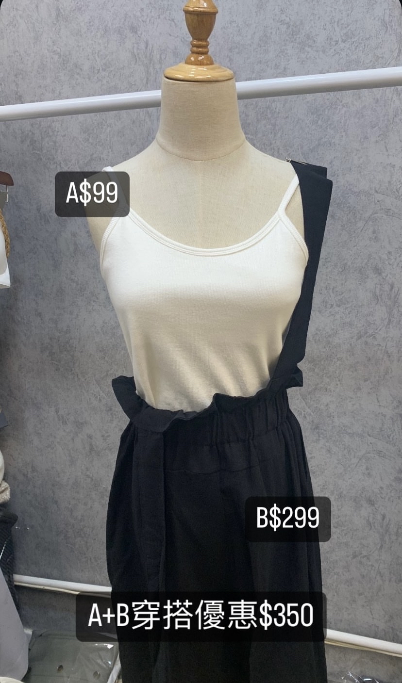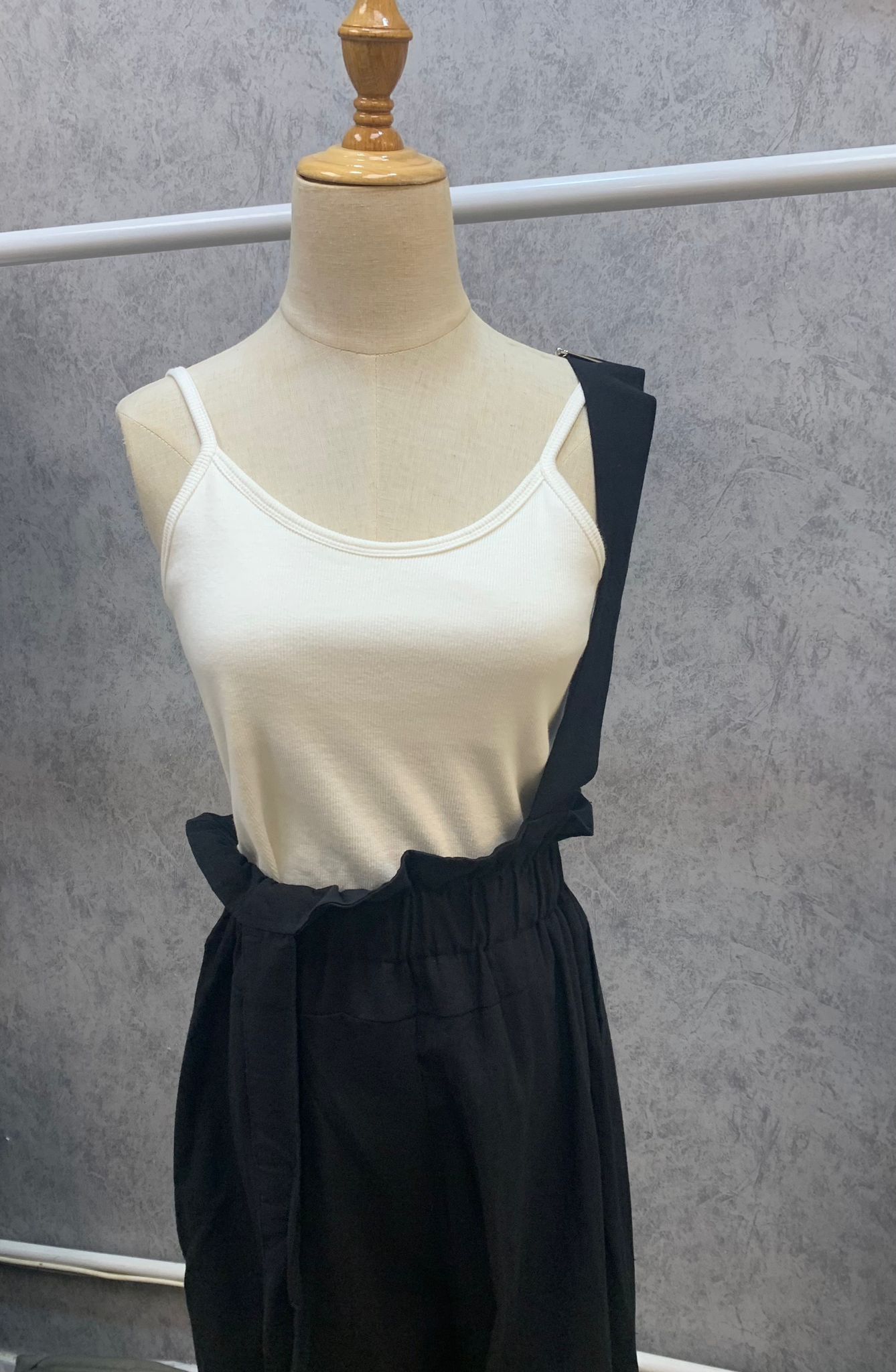 簡約時尚米白色背心+黑色高腰吊帶褲套裝