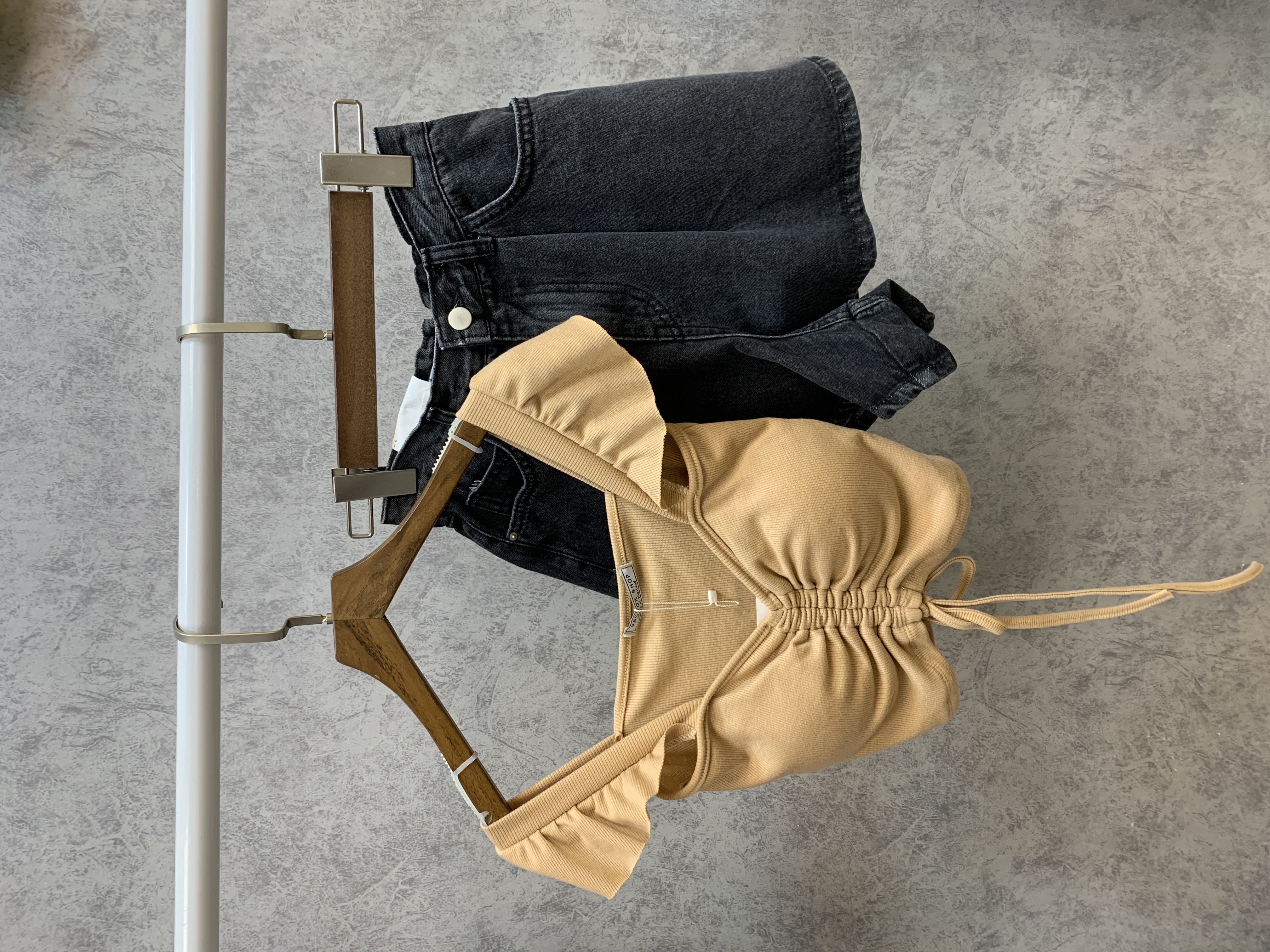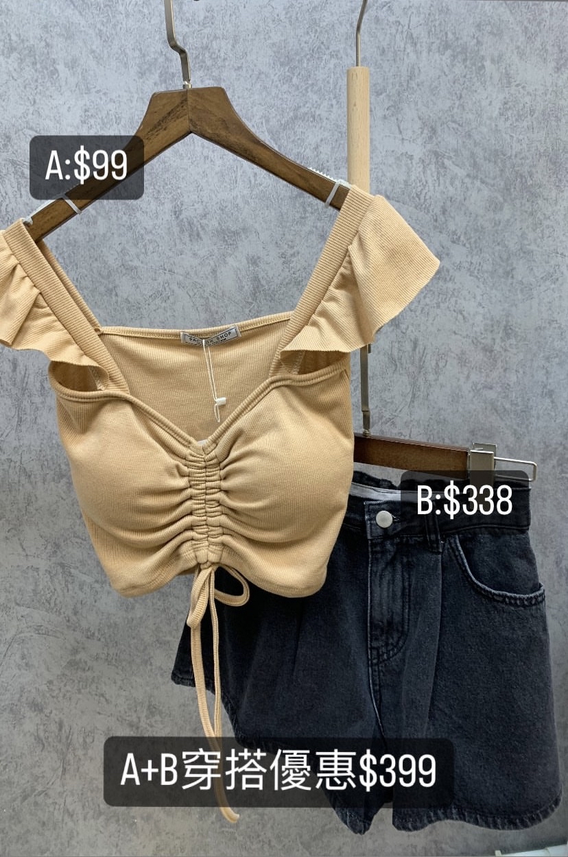 簡約時尚褶皺露肩上衣牛仔短褲套裝