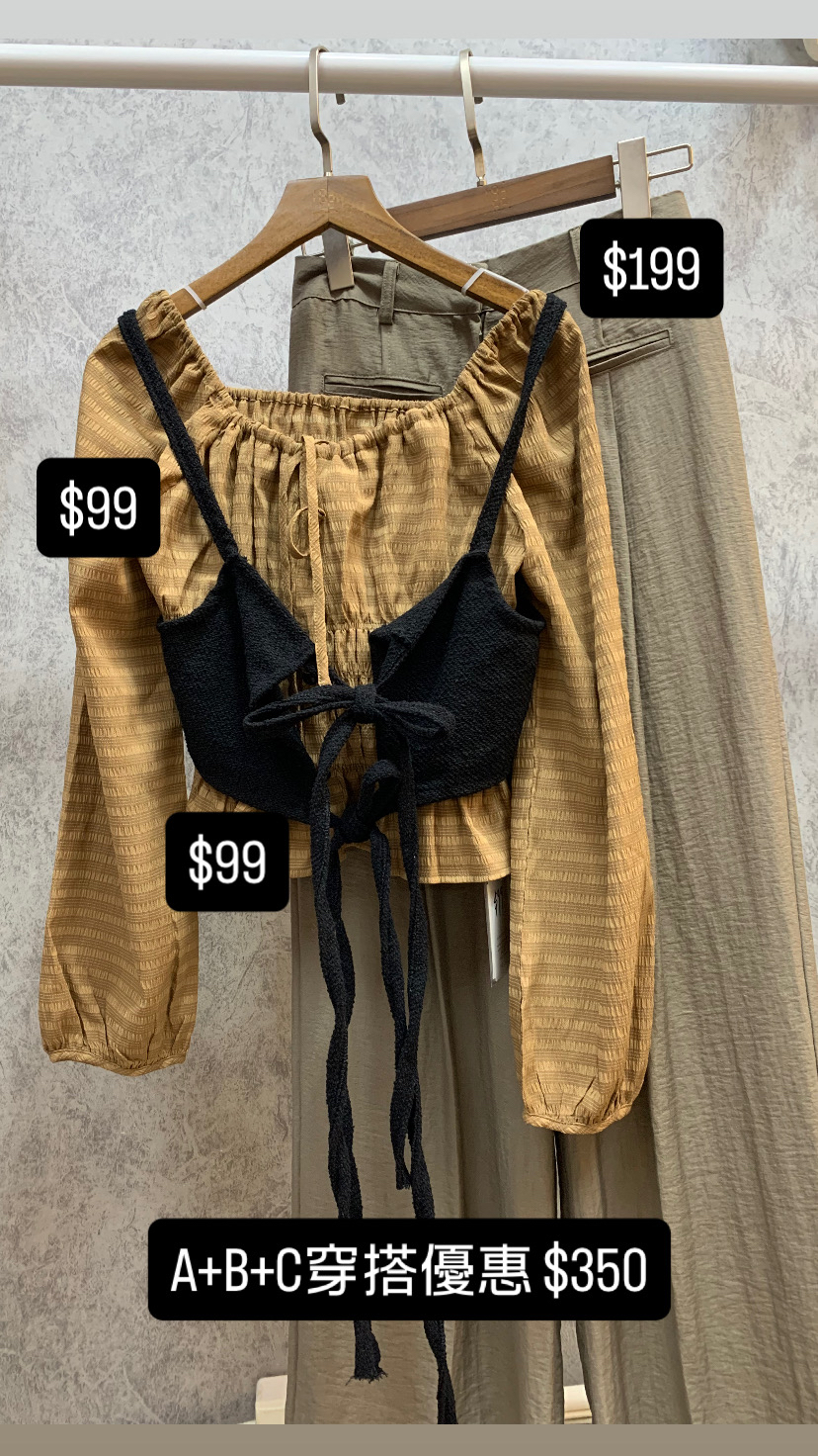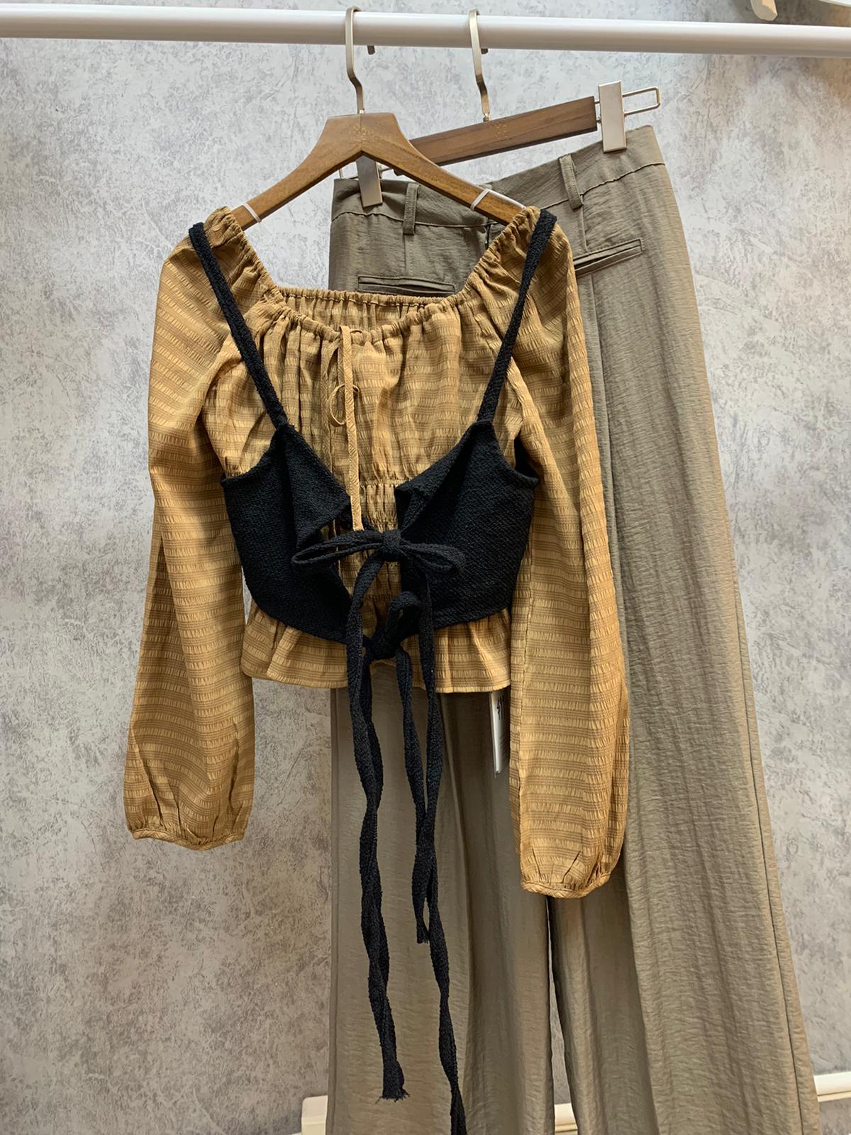 荷葉邊方領上衣+黑色針織外搭+卡奇色長褲