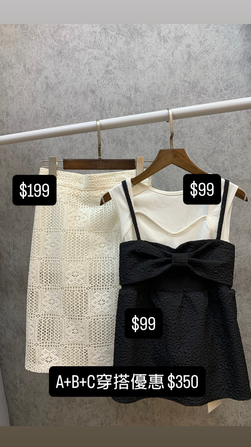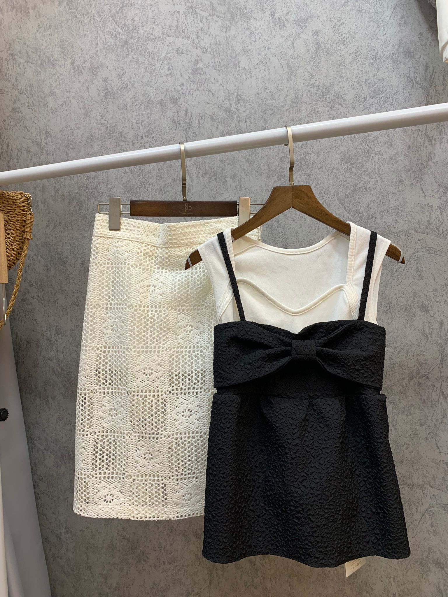 黑白配蕾絲短裙+蝴蝶結上衣套裝